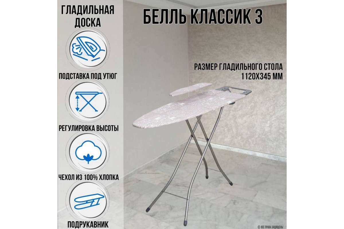 С гладильной доской Белль Классик 3 вы с легкостью справитесь с утюжкой вашего белья, получив отличный результат и экономя свое время и усилия. Гладильная доска с рабочей поверхностью из ДСП, чехлом из хлопка и подрукавником.
