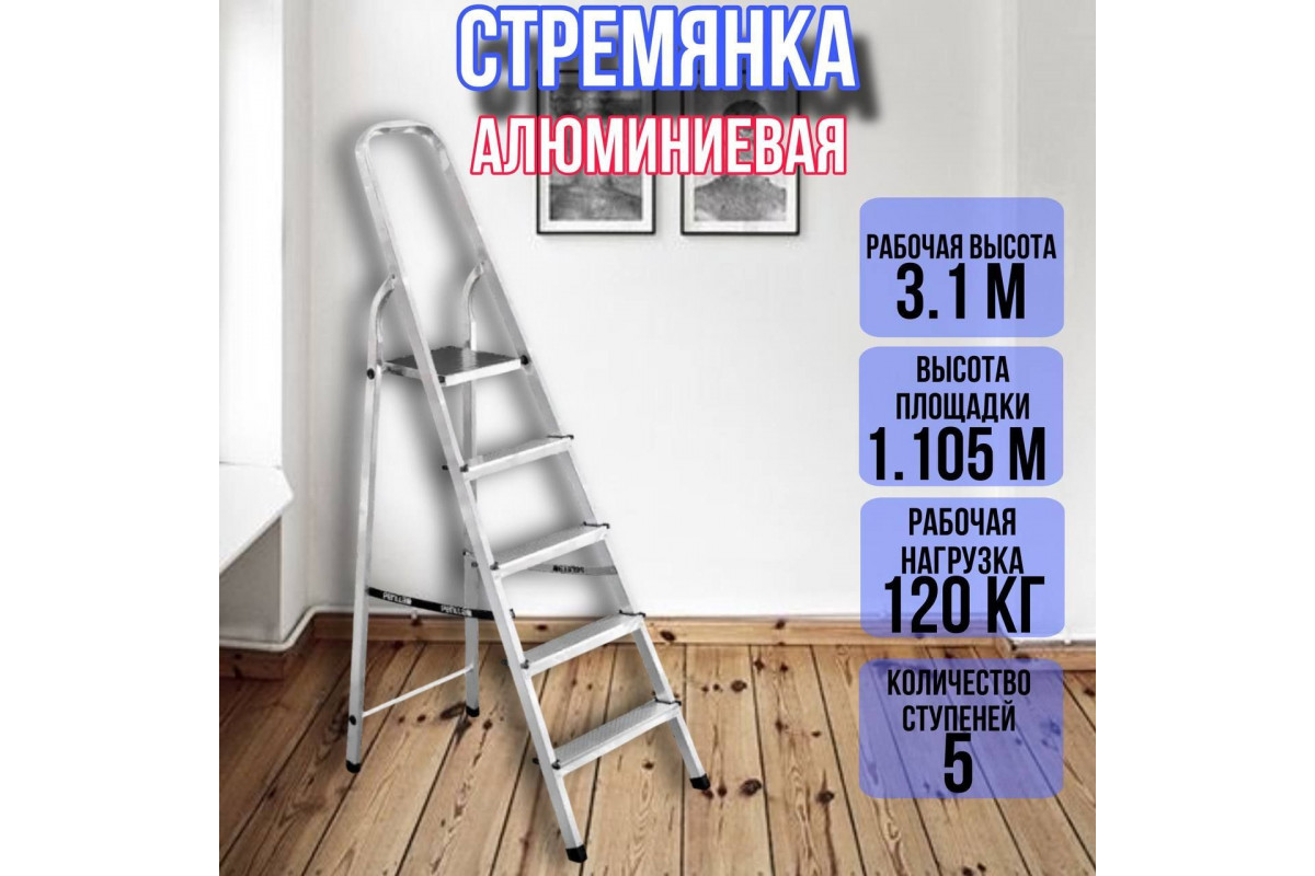 Стремянка оснащена пластиковыми заглушками, которые не оставляют следов на напольном покрытии. Конструкция способна выдержать нагрузку от взрослого человека, использующего стремянку в качестве опоры для инструмента.