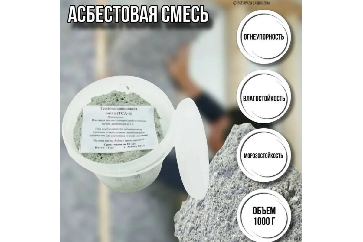 Асбест для печи дымоходов или асбестовая смесь для кладки печей огнеупорная 1000 грамм - асбест хризотиловый или асбестовая крошка,встречающееся в природе тонкое кристаллическое длинное волокно, которое при использовании в бетонных составах может улучшать свойства свежего и затвердевшего бетона, такие как прочность на сжатие и изгиб. В строительной промышленности он используется в тепло- и звукоизоляции, огнезащите, кровельных и напольных материалах. Изоляционные смеси для печи - это продукты, изготовленные путем смешивания и уплотнения асбеста в среде на водной основе. Они предназначены для изоляции различных поверхностей при температуре до 500°C. Асбестовая смесь или паста для печи и каминов состоит из асбеста, смешанного с вязкой основой, такой как глина или цемент. Она предназначена для использования в качестве термоизоляционного материала в печах и каминах. Асбест для печи дымоходов представляет собой специальную огнеупорную смесь, используемую при кладке печей и дымоходов. Эта смесь обладает высокой термостойкостью и стойкостью к воздействию высоких температур, что делает её идеальной для обеспечения надежной и безопасной работы печных систем. Асбестовая смеси часто применяется для соединения кирпичей, теплоизоляции и защиты от нагрева, что способствует повышению эффективности и долговечности печного оборудования. Однако, необходимо соблюдать меры предосторожности при работе с асбестом, поскольку его волокна могут представлять опасность для здоровья.